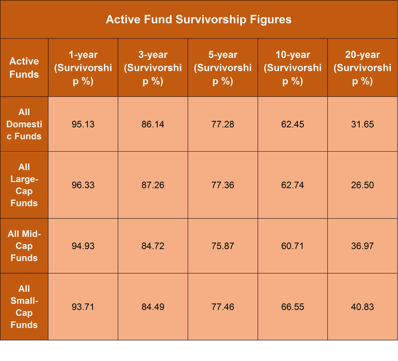Survivorship among active funds also declined across most categories with advancing time horizons and by the end of 20-year period, only 26.50% of All Large-Cap Funds had survived and rest were either merged or liquidated. You can find fund survivorship figures in the table below.