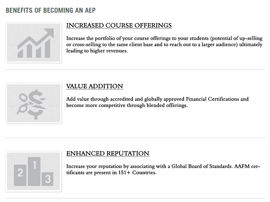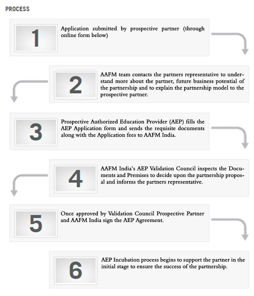 AAFM® India’s Authorized Education Provider is a unique program that aims to identify promising and upcoming training companies and institutes across the world which has the drive and the potential to move to the next level. AAFM® India will partner with these chosen Authorized Education Providers and will provide all the strategic and operational support necessary to ensure the success of the partner.
